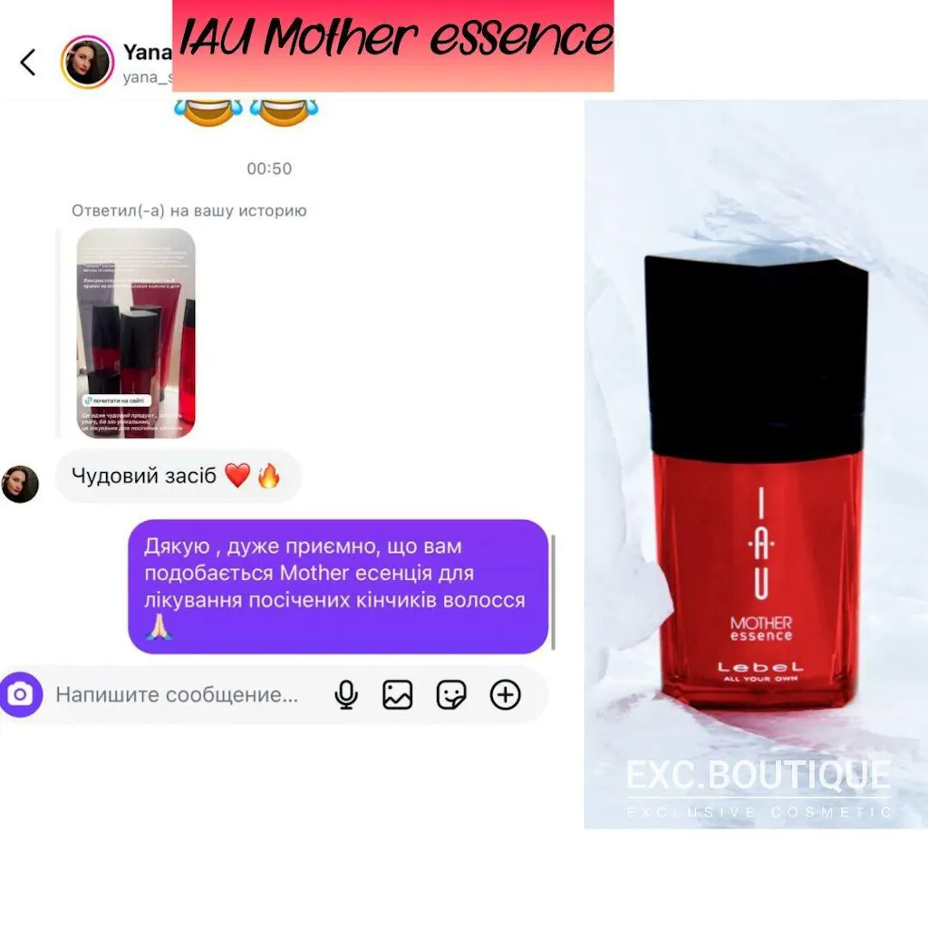 IAU Mother Essence - інноваційний комплекс, який ефективно лікує волосся, відновлюючи посічені кінчики та оновлюючи його структуру. Завдяки унікальному складу, есенція забезпечує глибоке зволоження кінчиків волосся, "запаює" посічені кінчики, забезпечуючи їм доглянутий вигляд та глянцевий блиск.