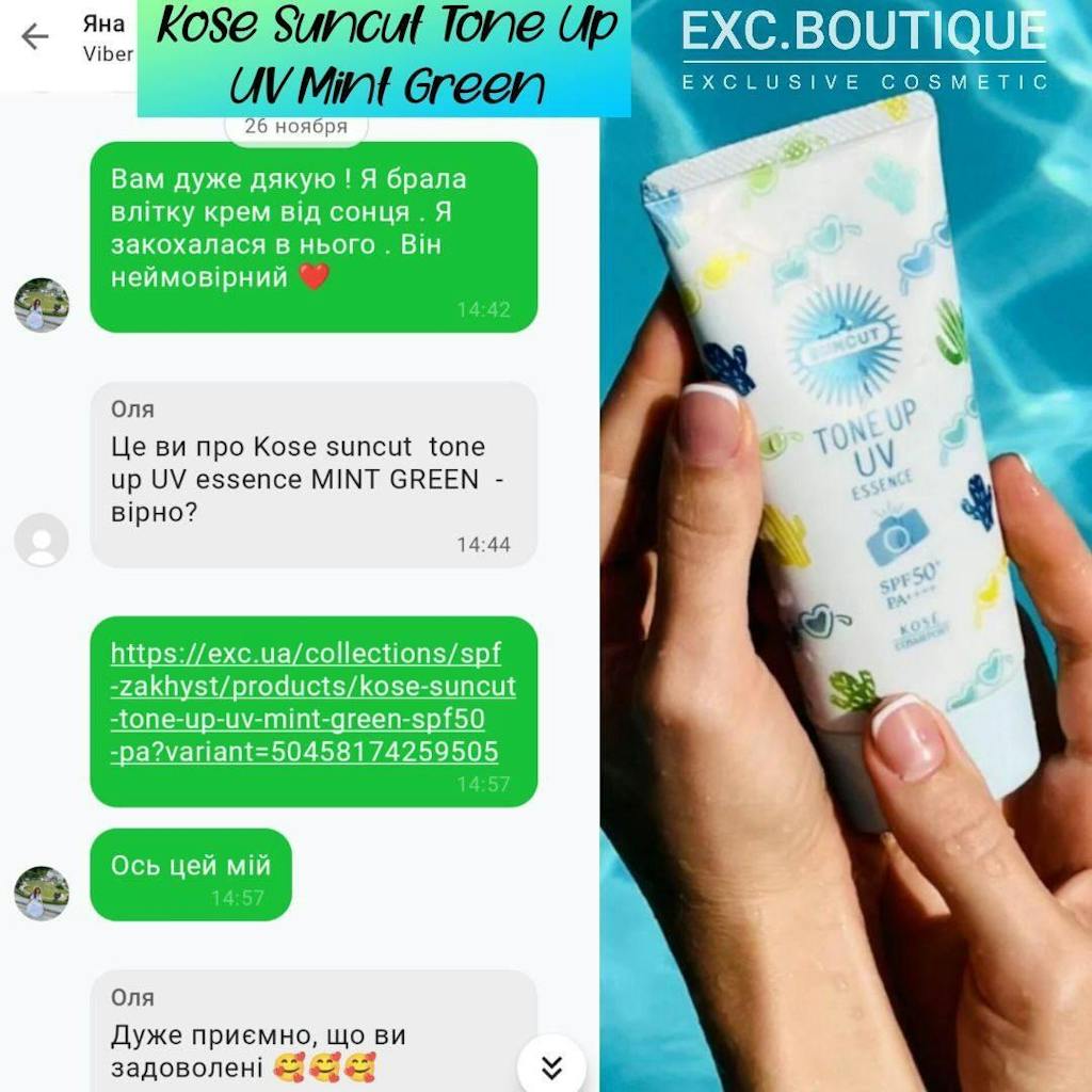 Унікальний засіб UV-Essence Mint Green SPF50+ PA++++ від японського бренду Kose доглядає за шкірою, надійно захищає її від негативного впливу сонячних променів, приховує нерівності та почервоніння. Завдяки легкій текстурі крем добре лягає на шкіру, не скочується і не обтяжує її, дає гарний оксамитовий аромат.