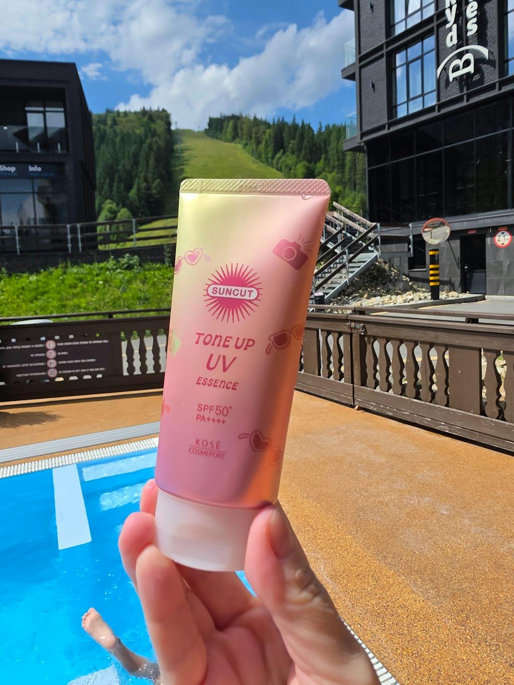 Ультра легкий санскрин Kose Suncut Tone Up UV Pink Flamingo Essence Sunblock від японського бренду Kose не тільки захищає шкіру від негативного впливу факторів зовнішнього середовища та сонячного випромінювання, але також освіжає та покращує тон шкіри завдяки рожевим пігментам у складі. Він, наче Photoshop, миттєво покращує колір обличчя, стирає сліди втоми, звужує пори, прибирає тьмяність і надає шкірі здорового сяйва. Цей японський сонцезахисний крем відрізняється якісним насиченим складом.