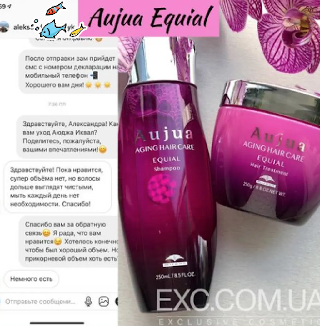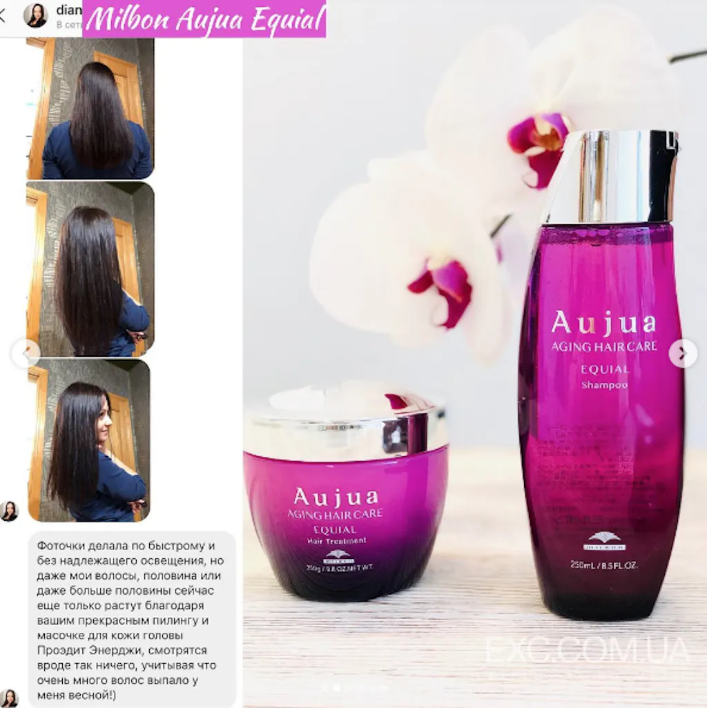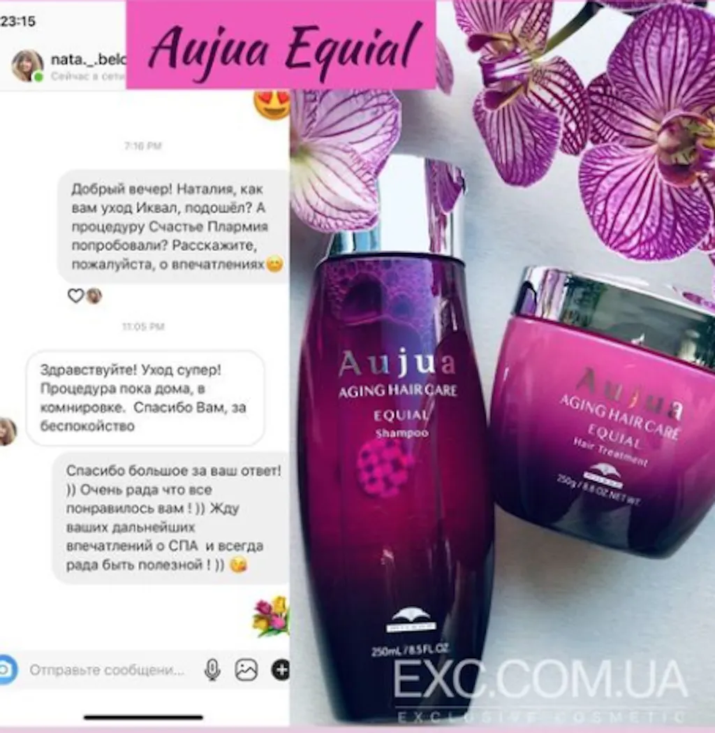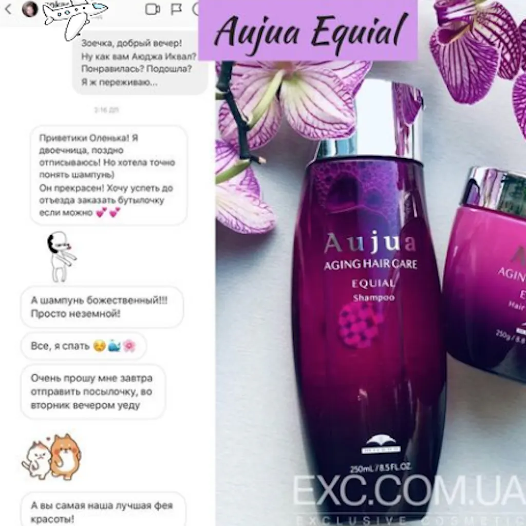 Ексклюзивний шампунь Aujua Equial веде боротьбу із втратою об'єму, повертаючи кожній волосині природну гнучкість і пружність, ущільнюючи їх, насичуючи необхідною вологою та поживними компонентами.