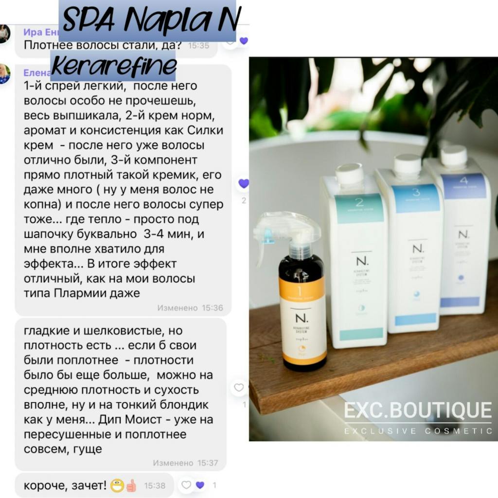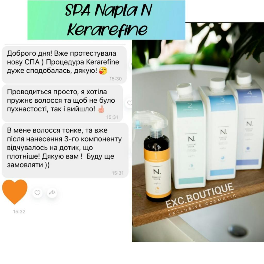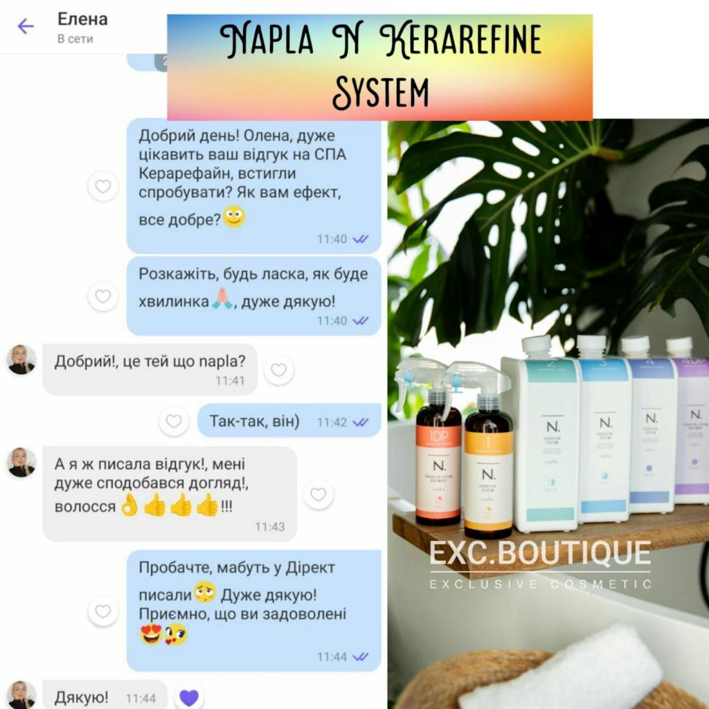 Інноваційна відновлювальна процедура N. KERAREFINE SYSTEM складається всього з 4 компонентів. Її дія заснована на новітній розробці фахівців бренду Napla — унікальному кератиновому комплексі Kerarefine.