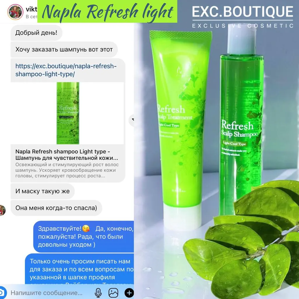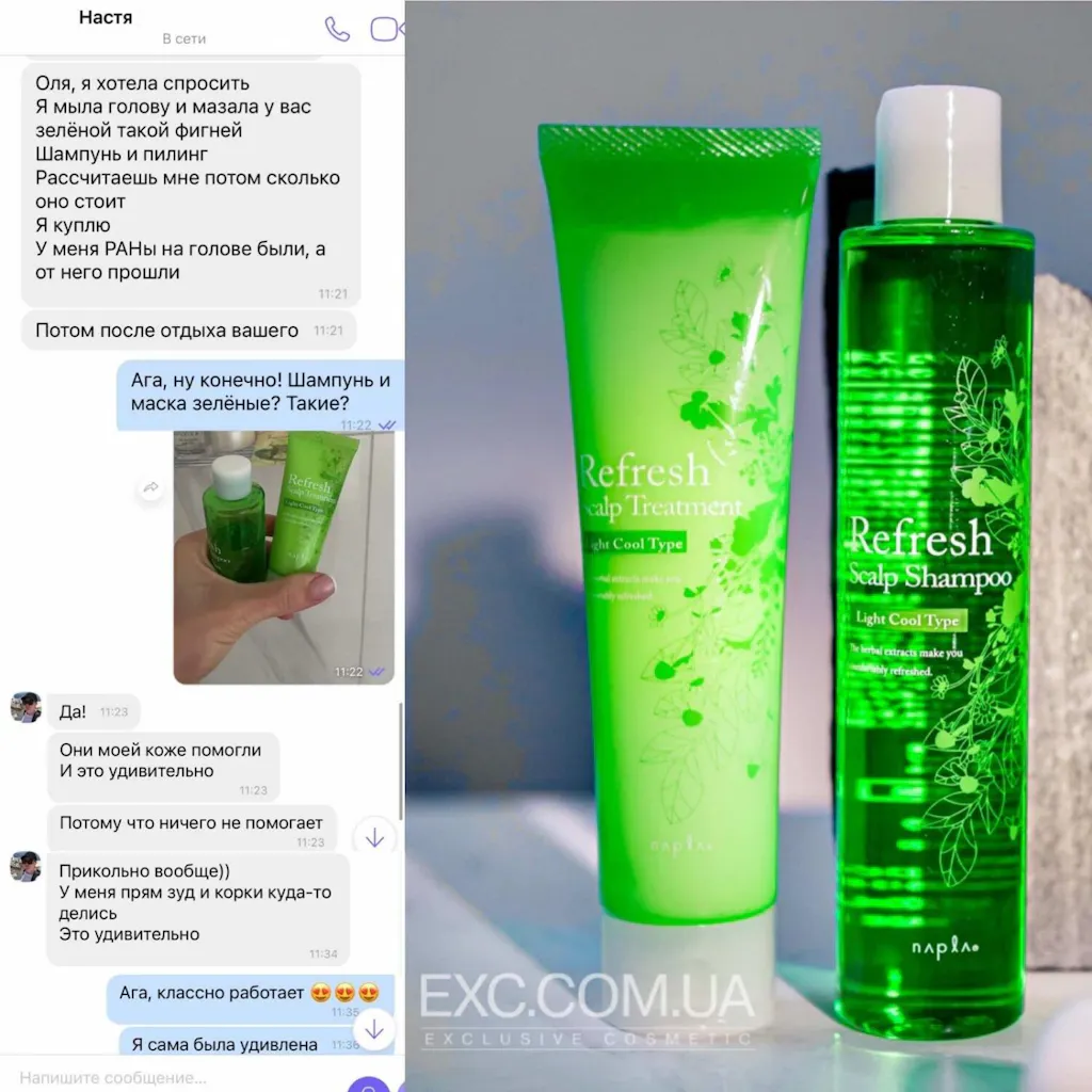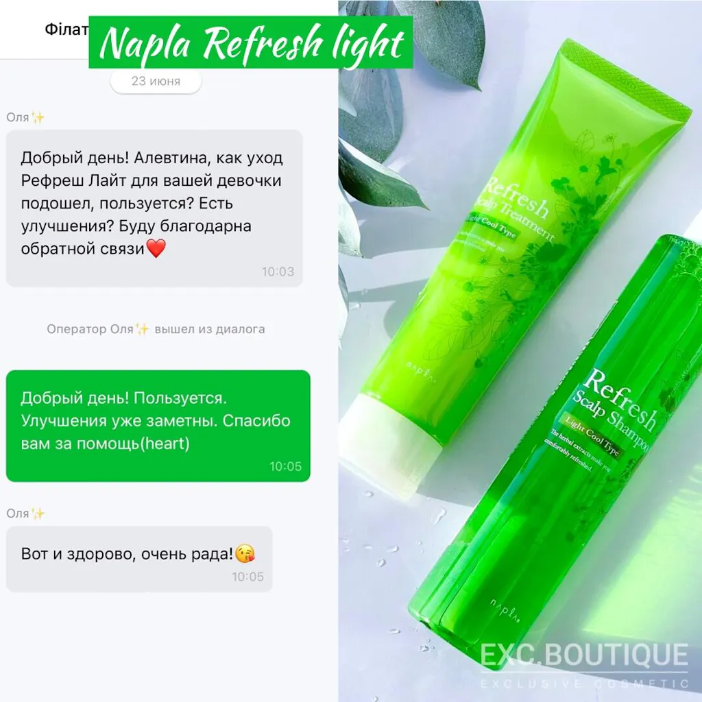 Обов'язковим компонентом догляду за проблемною шкірою голови є маска від компанії Napla - Refresh Treatment Light Type. Маска чудово підійде людям з чутливою шкірою голови – у складі містяться компоненти, що відповідають за регенерацію тканин.