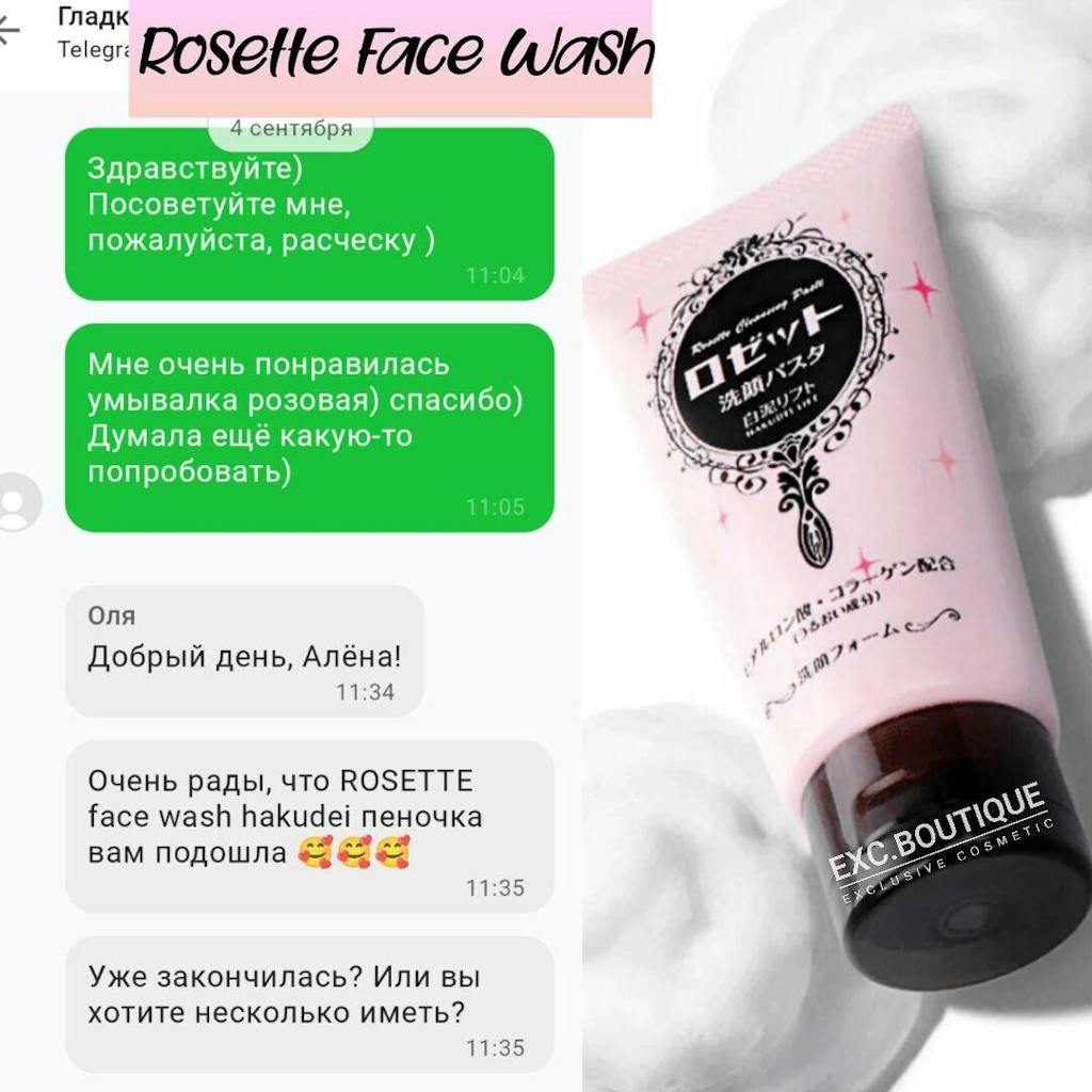 Rosette - пінка для вмивання з білою глиною, колагеном та гіалуроновою кислотою для пружності шкіри. М'який засіб без запаху, утворює велику кількість піни, не висушує шкіру, легко розчиняє шкірний жир, чудово видаляє різні види забруднень.