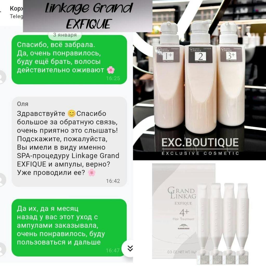Унікальна трикомпонентна відновлююча процедура Grand Linkage Exfique+ – це інноваційна розробка фахівців компанії Milbon. Вона інтенсивно зволожує локони, повертає їм пружність та еластичність, захищає від негативного впливу факторів зовнішнього середовища, а також продовжує стійкість та яскравість кольору фарбованого волосся.