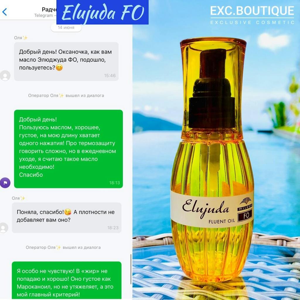 Кроме того, масло Milbon Elujuda FO (Fluent Oil) имеет термозащитные свойства, защищает локоны от механических повреждений и предотвращает впитывание посторонних запахов.