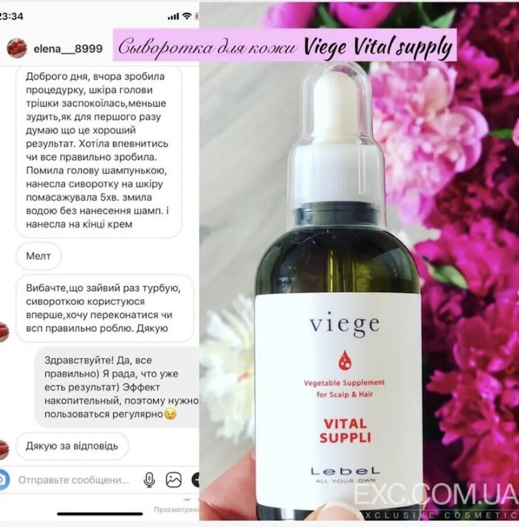 Сыворотка Viege vital suppli действует на кожу головы, интенсивно насыщая ее питательными веществами, белками, влагой, уплотняет структуру, запускает процессы регенерации. Кожа омолаживается и оздоравливается на клеточном уровне, из-за чего и волосы улучшают свое качество, становясь сильными, упругими и объемными.